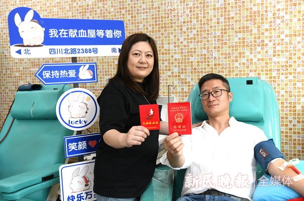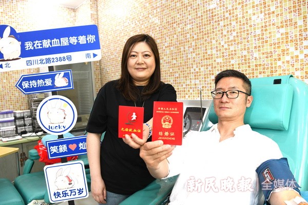 这天,夫妻俩还带来了结婚证,和同样红彤彤的无偿献血证摆在一起,留下了难忘的回忆。