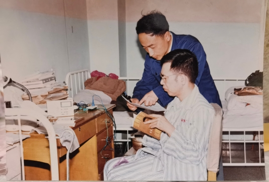 1984年,父亲因两次脑外伤不幸患上了帕金森综合征,这是一种损害神经系统的疾病,会导致人体肌肉越来越僵硬,难以控制。后来,父亲的进食吞咽和说话功能都受到了很大的影响,特别是眼皮一旦受外界刺激闭上,就很难自己睁开,需要用手辅助扒开,才可以继续阅读。我的父亲出生在1933年。少年时,旧社会生活的苦难,战争的残酷没有挫伤他的数学梦想;青年时,特殊的风暴没有阻碍他攀登科学高峰的脚步;人过不惑,鲜花与掌声没有消减他对工作的勤奋与执着。这一次,他面对的是对一个人来讲最大的挑战——生命健康。此时的他,早已波澜不惊,像一个敢于直面一切险阻的勇士,决心与时间赛跑,攀登不止。患病之后的12年间,父亲经常需要住院治疗。每次住院他都要带上手稿和很多资料,仍旧保持高强度的工作和不规律的作息习惯,他的作息时间从来不是根据钟表定的,而是完全取决于他的工作进度。这也因此让他成为了医院里“最不听话”的病号。医生们会向我的母亲“投诉”,让她多劝劝父亲按时休息,更好地配合治疗。母亲也是一位医生,她当然知道病人多休息配合治疗的重要性,但她更理解忘我的工作对她的丈夫有着怎样的意义。当时,父亲不管在哪里住院,都有两点要求。一是希望在病房中配一张书桌。二是打点滴时不要扎他的右手,因为他要持笔工作。有时,左手扎肿了,他宁可扎脚也不愿扎他的右手。就这样,父亲把病房变成了书房。