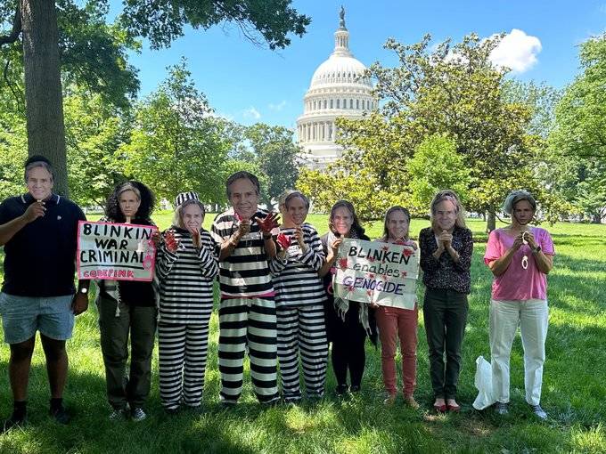 听证会开始前,抗议者在国会前指控布林肯“战犯”。图自“粉红准则”社交媒体账号