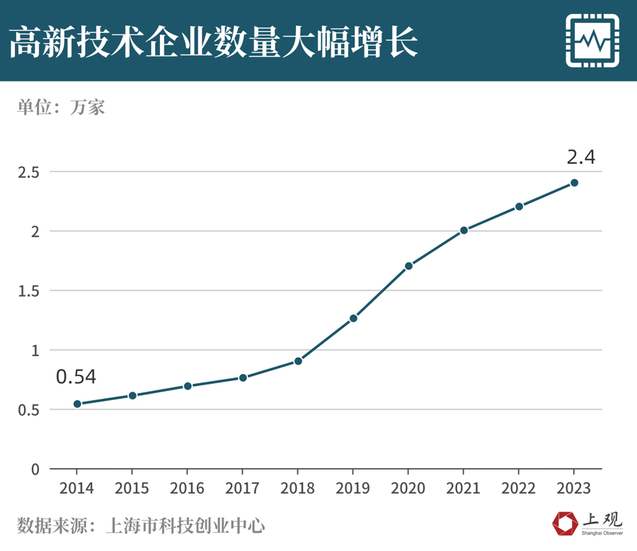 回首过去10年,上海的科创浓度持续上升。以有效期内的高新技术企业数量为例,2014年为5433家,2023年已达到2.4万家。高新技术企业数量的猛增,为科创板上市企业培育提供了沃土。截至今年4月,上海的科创板上市企业共91家,在全国各省区市中排名第二;总市值超1.27万亿元,位居全国第一。
