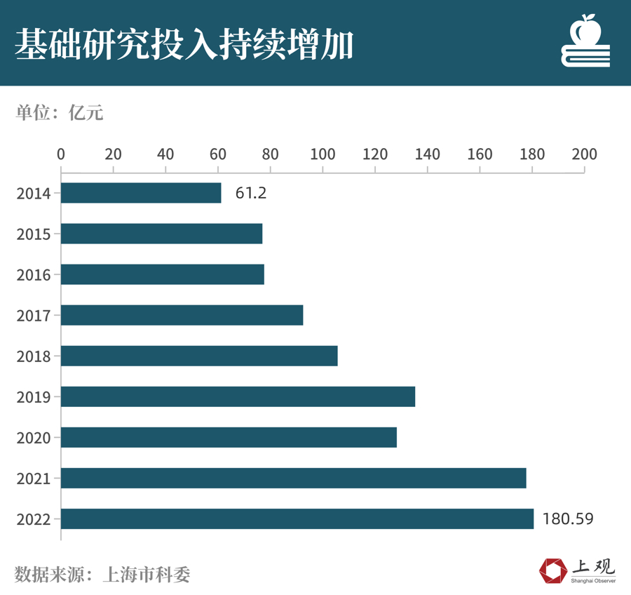 上海基础研究投入2014—2022年持续增加(2023年数据还未发布)。