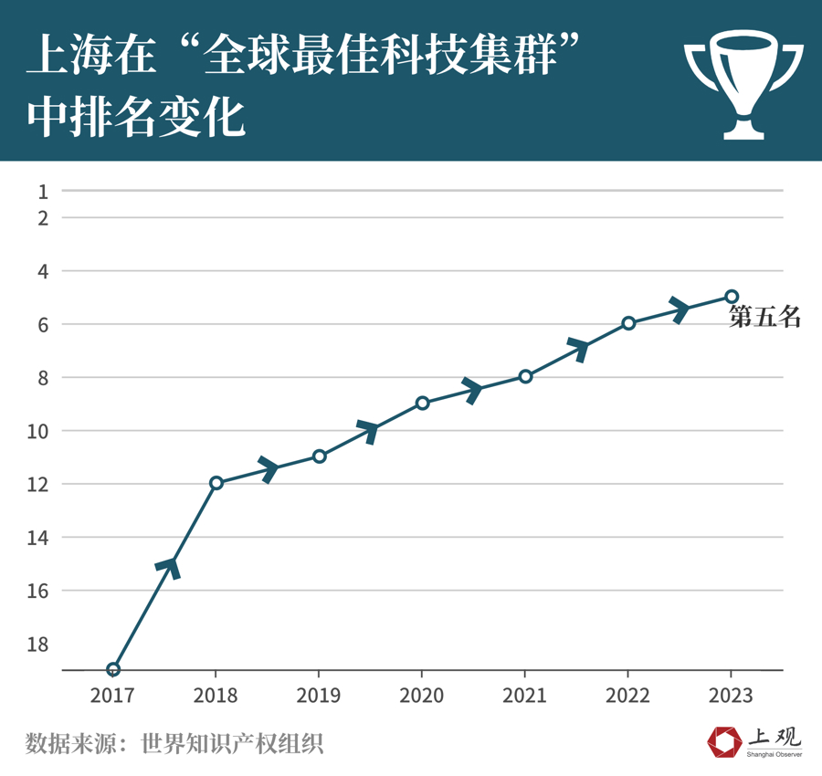 19、12、11、9、8、6、5——这是世界知识产权组织《全球创新指数报告》2017年发布“全球最佳科技集群”以来,上海历年的排名变化。在2023年“全球最佳科技集群”榜单上,上海—苏州位居全球第5。如果将上海单列,则排名全球第6。