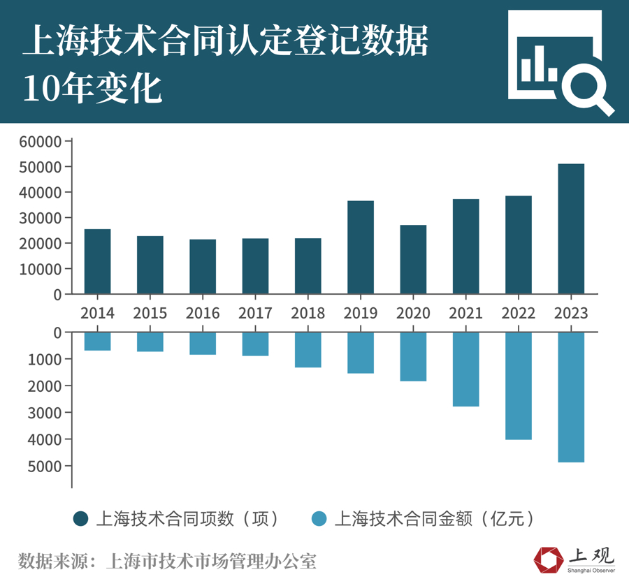 “三部曲”的成效,从上海技术合同认定登记数据的10年变化可见一斑。2014—2018年,经上海市技术市场管理办公室认定登记的合同项数都为2万余项;从2019年起,开始超过3万项,2023年达到50824项。合同总金额也大幅增长,从2014年的667.99亿元增至2023年的4850.21亿元。