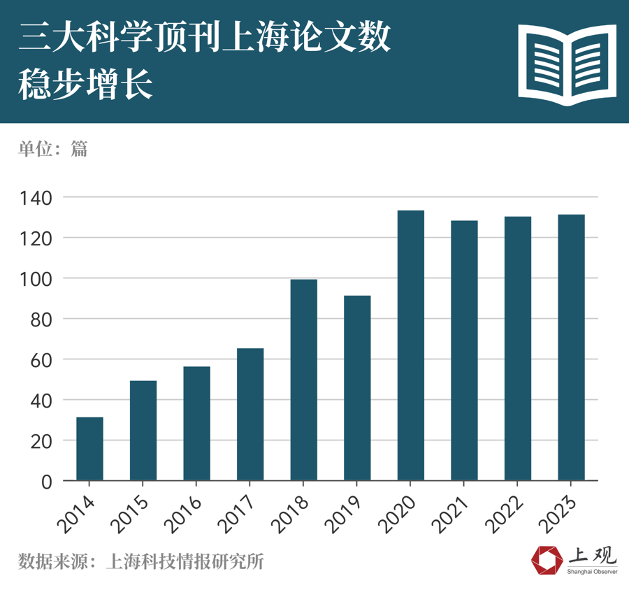 论文方面,上海不仅在数量上持续增加,更是在国际三大顶尖科学期刊上,发文数量显著增长。上海科技情报研究所的统计数据显示:2014年,上海科研人员在《自然》《科学》《细胞》上发表论文31篇,占全国17.51%;2023年,达到131篇,占全国26.63%。