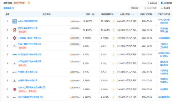 股东信息显示,该公司由财政部、国开金融有限责任公司、上海国盛(集团)、工商银行、建设银行、农业银行、中国银行、交通银行等19位股东共同持股。