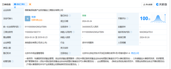 据了解,国家集成电路产业投资基金三期股份有限公司法定代表人为张新,注册资本3440亿,经营范围为私募股权投资基金管理、创业投资基金管理服务,以私募基金从事股权投资、投资管理、资产管理等活动,企业管理咨询。