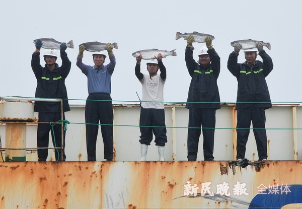 图为在距离山东日照海岸线10余海里处的蓝山海域,生长于“财经海上粮食仓1号”首座网箱的20万尾三文鱼进入收获期,标志着中国三文鱼近海养殖取得成功