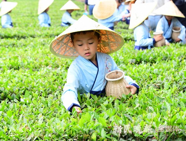 图为在日照后村镇竹园社区茶园里。数十名学生到荣策茶园采茶。目前,日照市已发展成为世界三大海岸绿茶城市之一