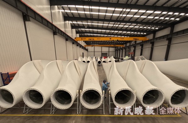 图为工人在日照经济技术开发区金马新能源有限公司风力发电叶片生产车间工作