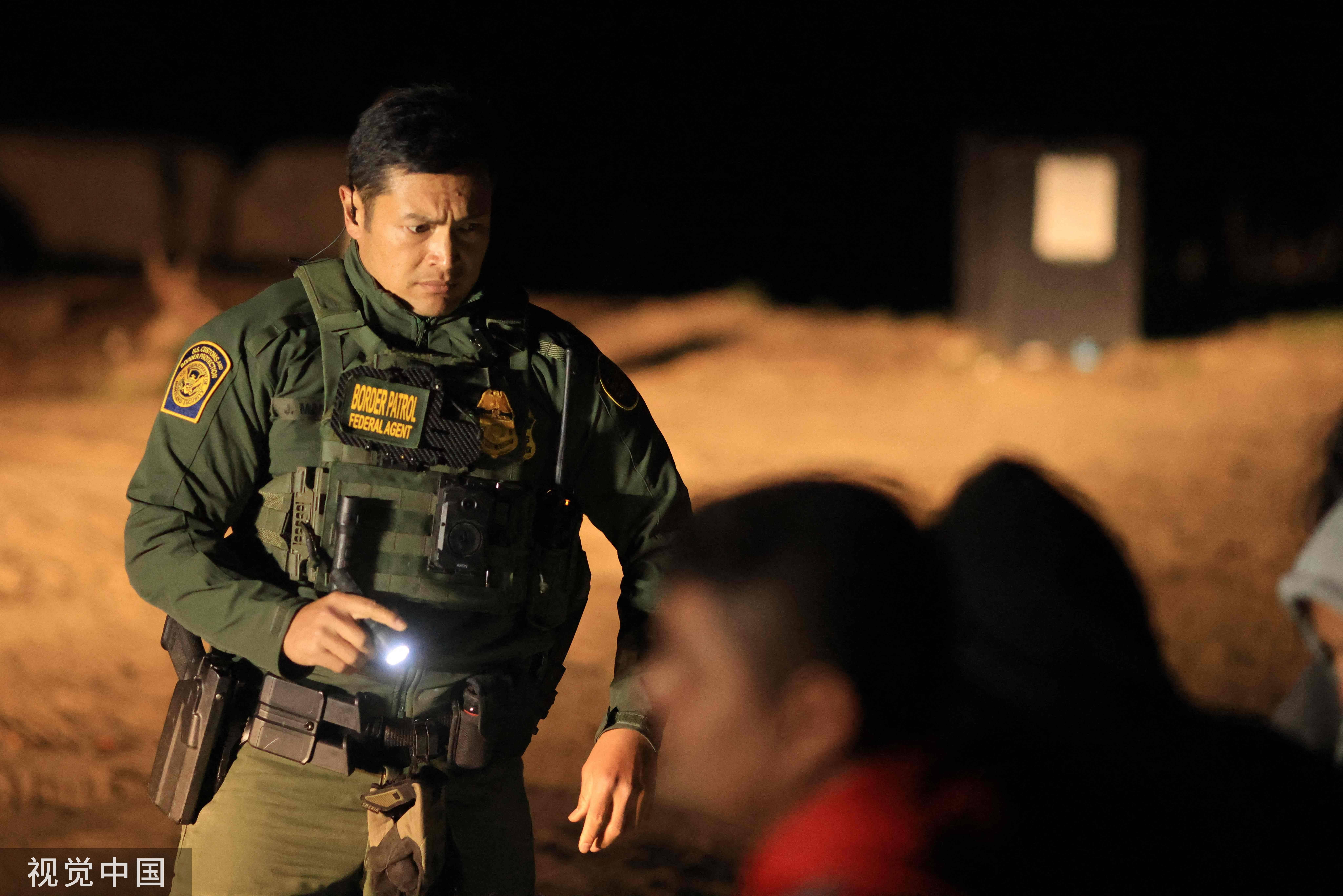 当地时间2024年4月3日,美国加州,美国边境巡逻人员在美墨边境围栏附近处理移民。