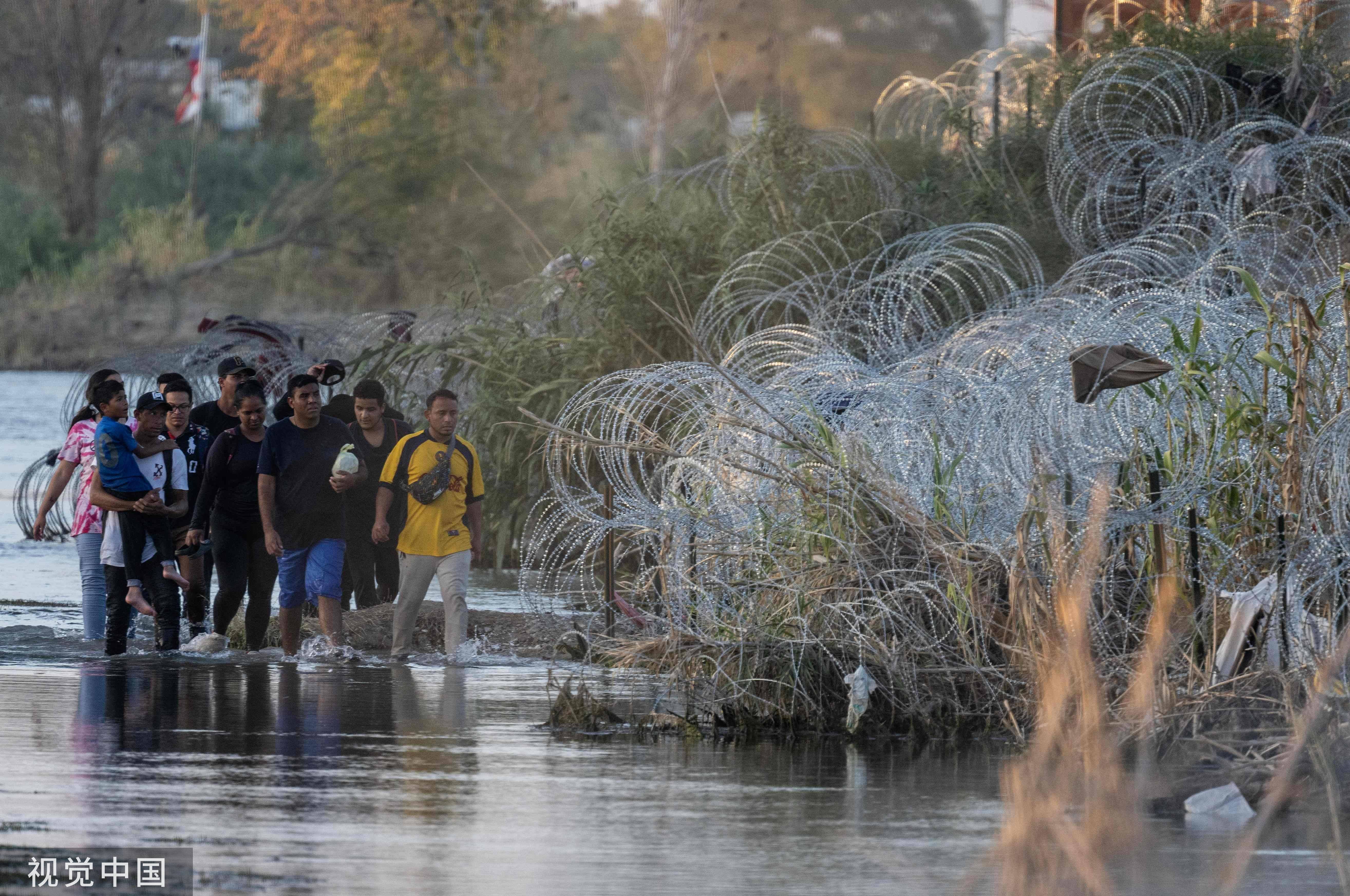 当地时间2023年9月23日,美国伊格尔帕斯,在得克萨斯州鹰口的美墨边境,非法移民们沿着铁丝网寻找穿越格兰德河的地方。