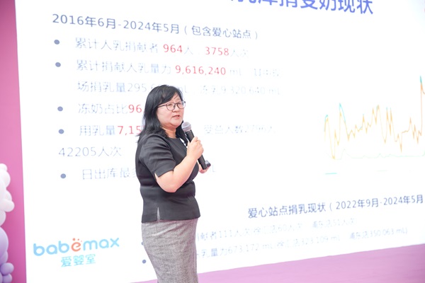 上海市儿童医院人乳库负责人、消化感染科张婷主任详细介绍了人乳库的总体运营情况。她表示,如今人乳库母乳捐献者达到955人,捐赠人次达到3729人次,累计捐献母乳量9451785毫升。已经成功为2681名高危宝宝提供了母乳支持,累计受益人次达到40670次,使用母乳量共计8760640毫升。这些成果的取得离不开所有爱心妈妈、医护志愿者以及社会志愿者的共同努力。
