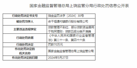 东方资讯消息,日前,国家金融监督管理总局上饶监管局行政处罚信息公开表显示,因贷款管理不到位,部分贷款资金挪用于购买理财;贷款五级分类不准确,对余干恒通村镇银行股份有限公司进行罚款70万元处罚。