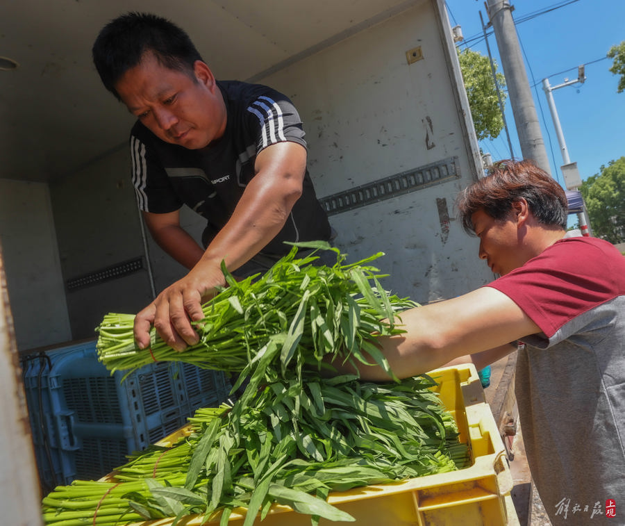 有着500亩蔬菜基地的小张介绍,他在青浦种植的品种有空心菜、红米苋、生菜、鸡毛菜等,现在每天第一件事就是将成熟的蔬菜收好打包装车发往光明食品集团所属线下销售平台终端。