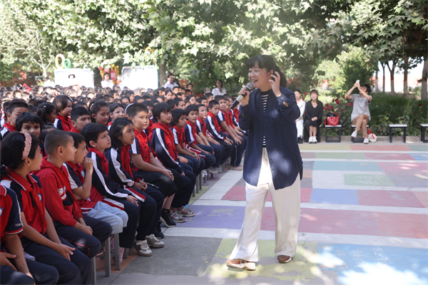 她分享了“芒果街上的小屋”和“陶瓷兔子爱德华”两个来自童书的故事,孩子们跟着她一起挥动手臂,朗诵书里的诗歌:“我想成为/海里的浪,风中的云……”阳光热烈,树影婆娑,台上台下共同沉浸在文学阅读的美好之中。