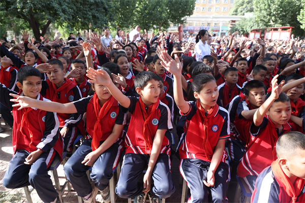 近两千名学生汇聚在一起,唱国歌,行少先队礼,场面令人动容。