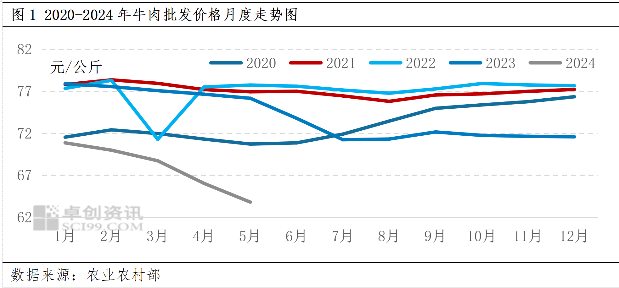 2020-2024年牛肉批发价格月度走势图。来源:卓创资讯
