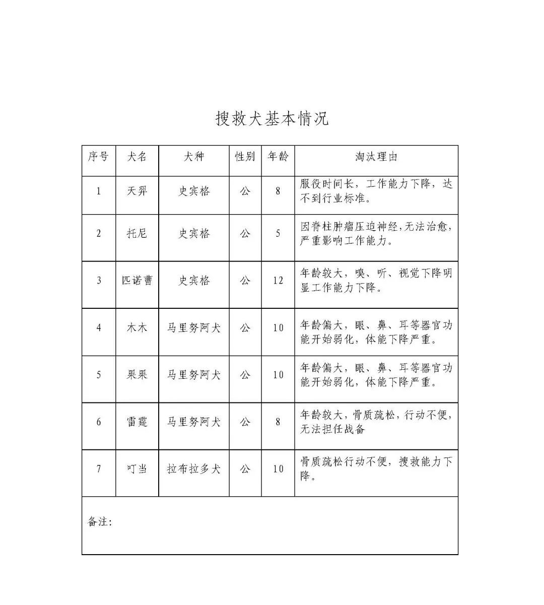 公告发布了领养条件、领养办法、领养人需提供材料以及搜救犬只基本情况。