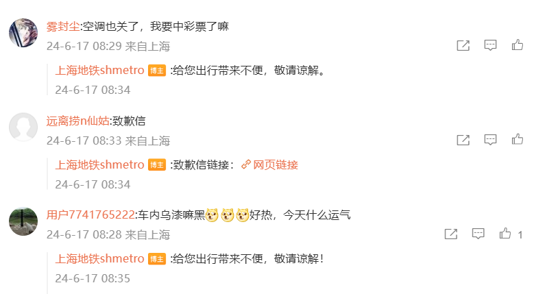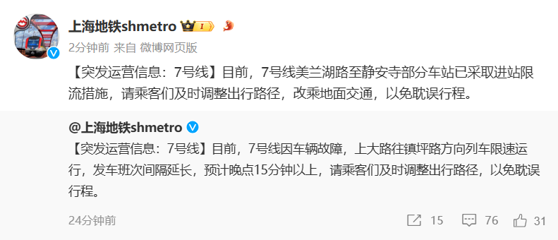 当日稍早,@上海地铁shmetro曾发布信息:7号线因车辆故障,上大路往镇坪路方向列车限速运行,发车班次间隔延长,预计晚点15分钟以上,请乘客们及时调整出行路径,以免耽误行程。随后,上海地铁发布了电子致歉信,受7号线故障影响的乘客可通过上海地铁官网运营专页获取致歉信。