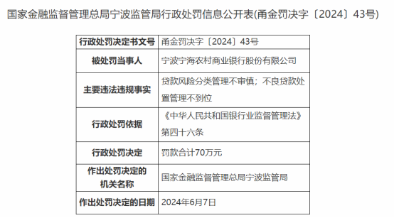因不良贷款处置管理不力等,宁波宁海农商行被罚70万元