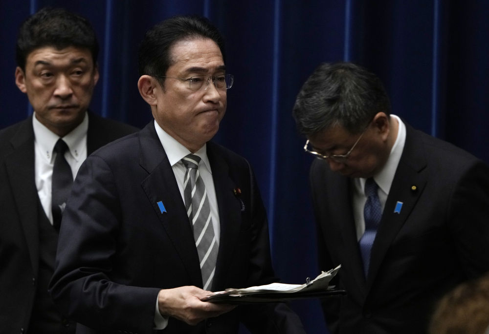2023年12月13日,日本首相岸田文雄(中)在日本东京首相官邸召开记者会后走过内阁官房长官松野博一(右)。新华社发(Pool图片,弗兰克·罗比雄摄)