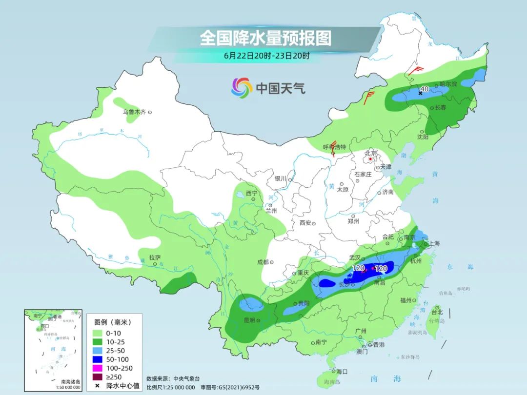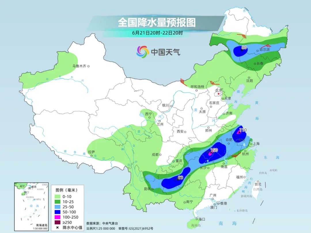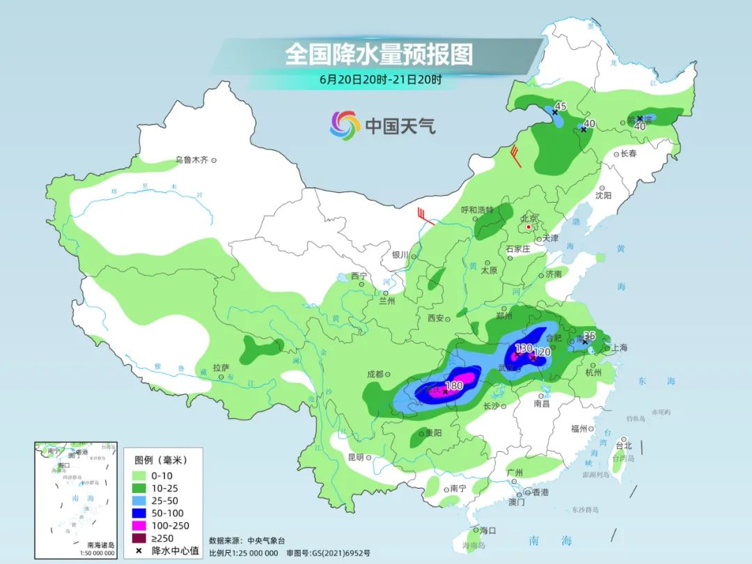 中央气象台预计,21日至24日,河南南部、湖北、江苏、安徽、贵州、云南中东部、湖南北部、江西北部、上海、浙江中北部等地将自北向南先后有大到暴雨,湖北、安徽、江苏等地局地大暴雨,贵州南部、湖北东部、湖南中北部、江西北部、安徽中南部、江苏南部、浙江西部等地累计降雨量100~180毫米,局地200~300毫米。强降雨时段出现在21日夜间至23日,其中明后两天大暴雨范围最大。