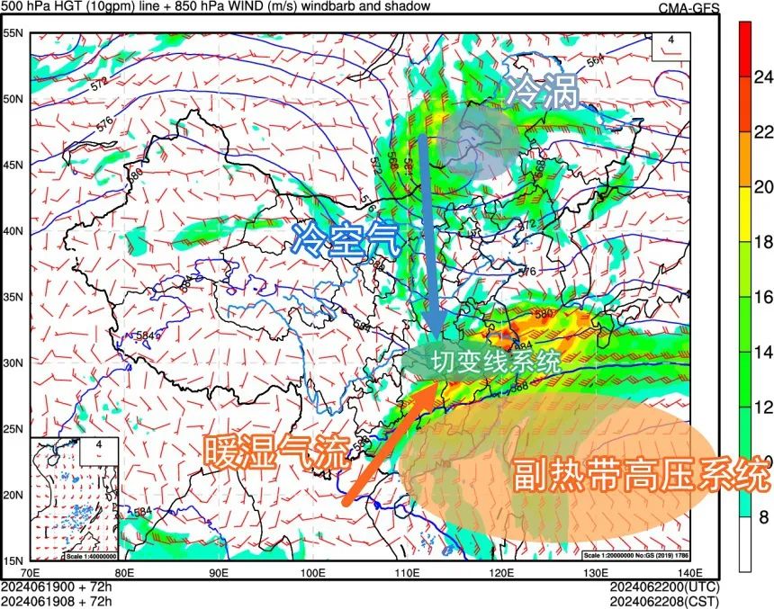 ↑ 可参考此图,这就是最典型的梅雨形势,接下来几天的情况跟它高度贴合,不过副高位置更偏北,强降雨集中区域也更为集中在江淮、江汉一带。