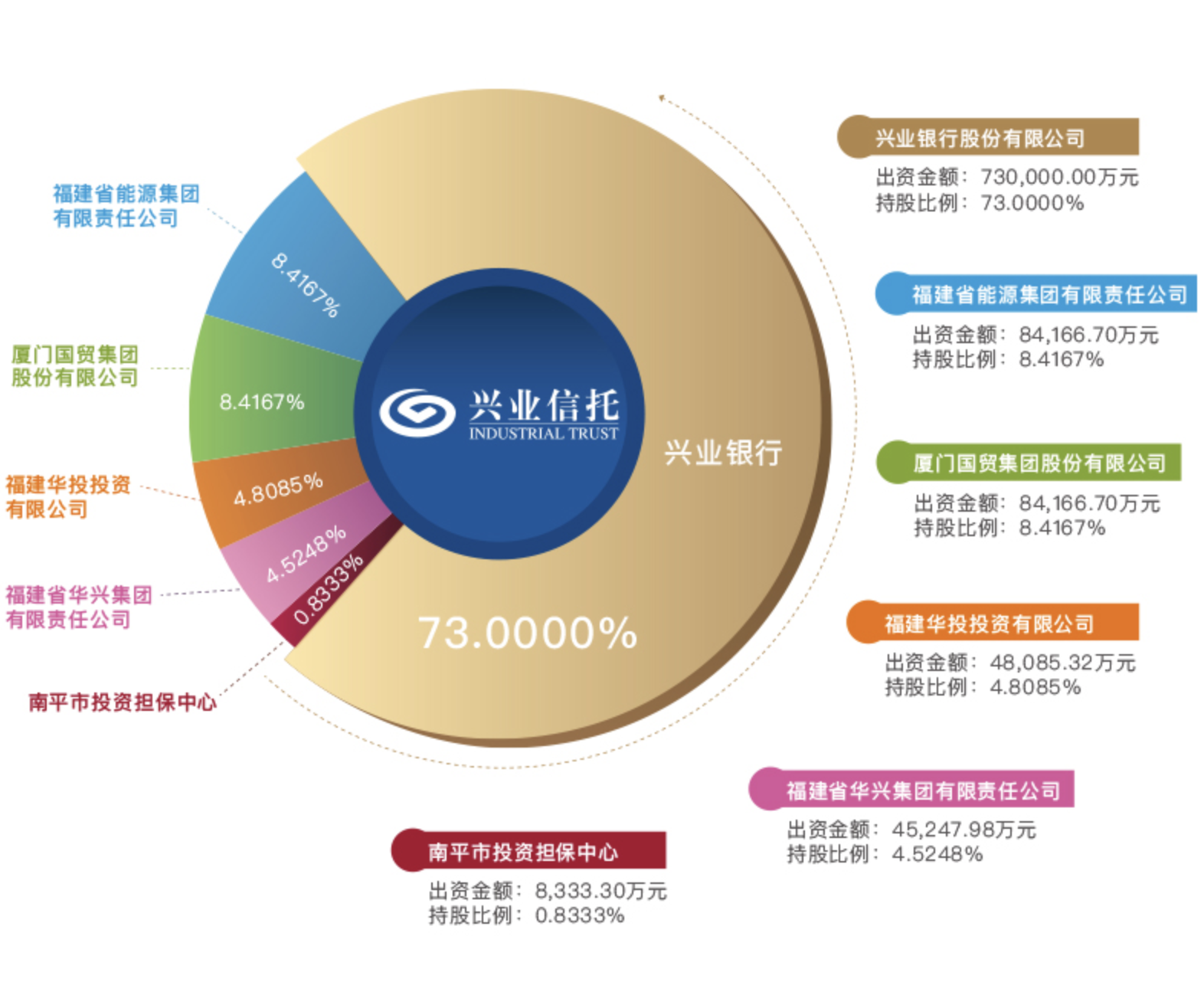 股权信息显示,兴业信托股东总数为6家,其中主要股东5家。兴业银行为兴业信托的控股股东,持股73%;福建省能源集团有限责任公司持股8.4167%;厦门国贸集团股份有限公司持股8.4167%;福建华投投资有限公司持股4.8085%;福建省华兴集团有限责任公司持股4.5248%。
