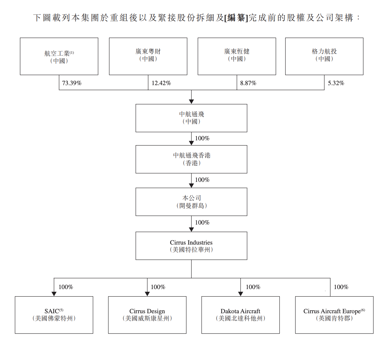 招股书显示,西锐飞机的股权由中航通飞香港100%持有,中航通飞香港由中航通飞全资拥有,而中航通飞由航空工业持股73.39%、广东粤财投资控股有限公司持股12.42%、广东恒健投资控股有限公司持股8.87%、珠海格力航空投资有限公司持股5.32%。
