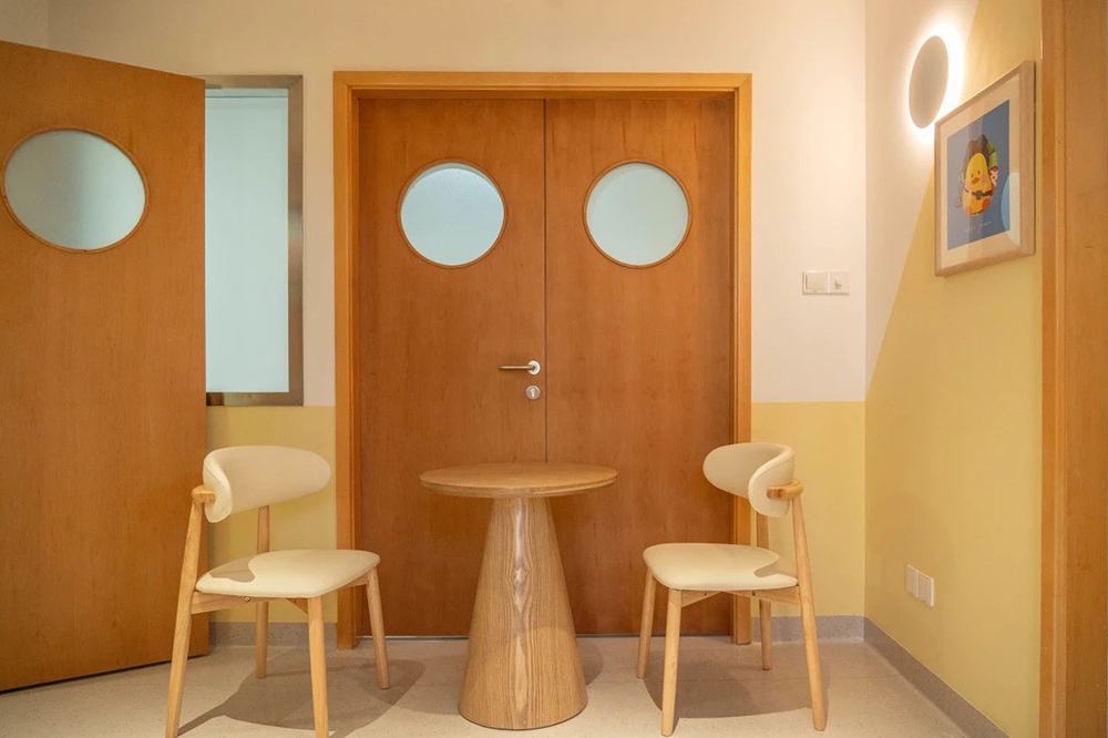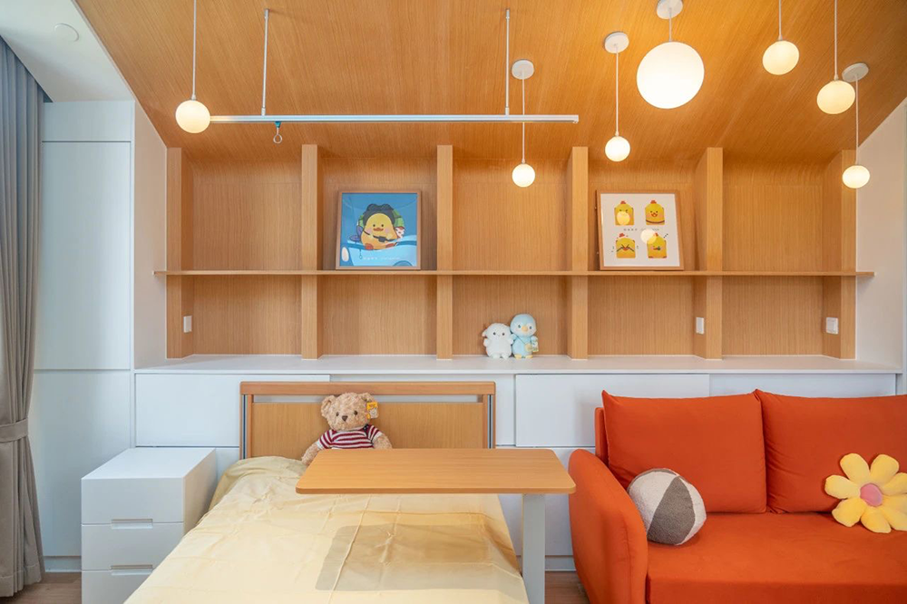 在落地实践方面,这个空间也充分考虑了患者生活与治疗的实用性。患者区设置在房间内侧,临近采光窗,有利于患者的精神舒缓;陪护区临近患者区,方便照护,儿童游戏区也在一旁,方便家属就近陪同游戏;房间合理规划了足够的储物空间供患者家庭使用,走廊区还特别划分了一个待客区域和独立的卫生间。
