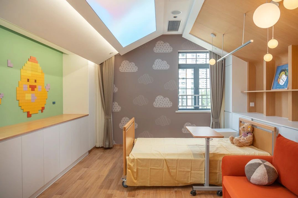 这个小屋坐落在医院6楼的走廊尽头,是一个有病房、卫生间的小套间,走廊也被利用起来作为一个小厅。其中,仅病房空间就有二十多平方米,两侧有窗,富有童趣,是一个为重症儿童及其家庭设计的更友好、更温暖、可陪伴和可告别的关怀空间。