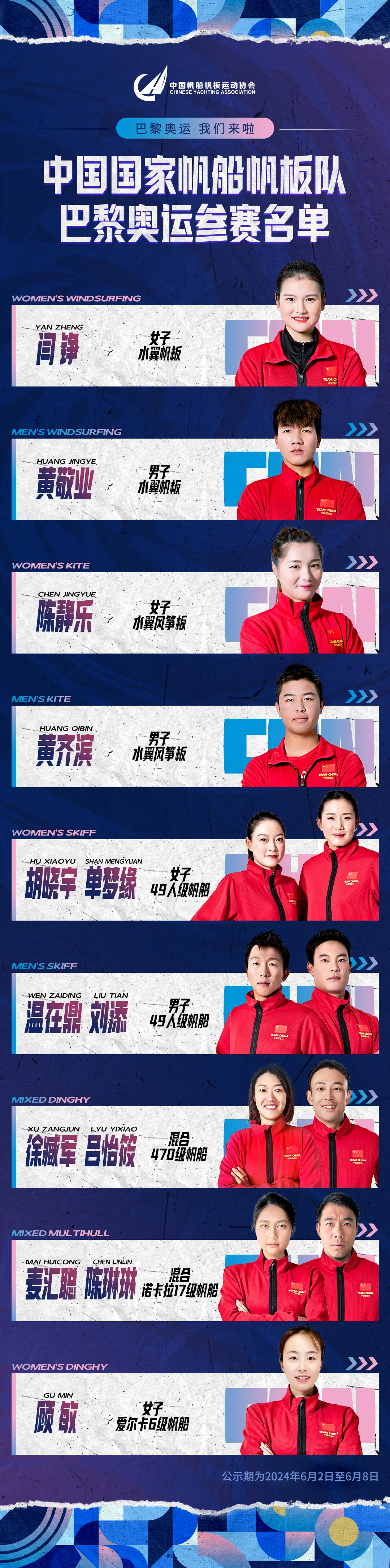 本届巴黎奥运会帆船帆板赛事将在当地时间7月28日-8月8日在法国马赛举行。其中,男子水翼风筝的竞赛日期为8月4日至8月8日,女子ILCA6级的竞赛日期为8月1日至8月6日。让我们一起为黄齐滨、顾敏加油!为国家帆船帆板队加油!