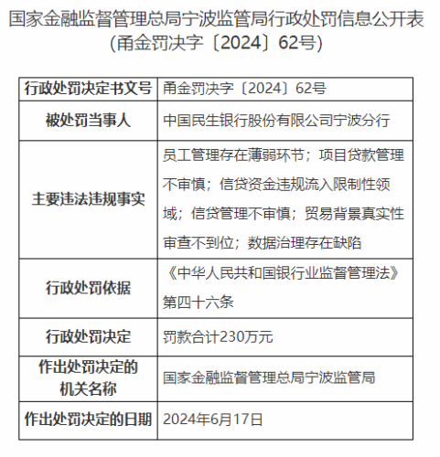 因员工管理薄弱等,民生银行宁波分行收230万元大额罚单!