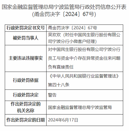 因员工与资金中介存在异常资金往来问题负有直接责任,对时任发生银行宁波分行小微客户经理吴欢欢进行警告处罚。