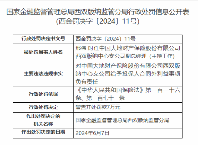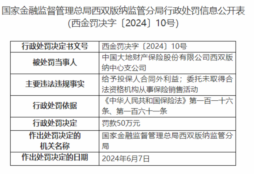 因给予投保人合同外利益,大地财险西双版纳支公司被罚50万元