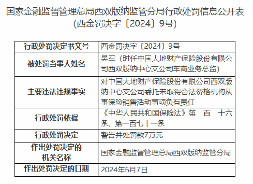 因对委托未取得合法资格机构从事保险销售活动事项负有责任,对时任西双版纳中心支公司车商业务总监吴军进行警告并处罚款7万元处罚。