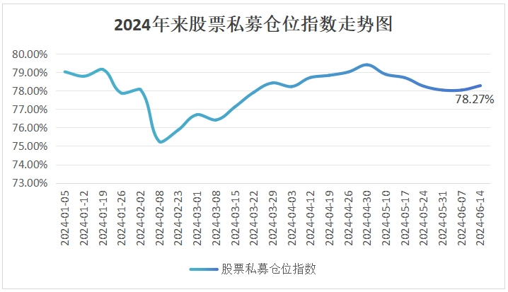 虽然近期大盘持续调整,但5月来股票私募首次加仓。私募排排网数据显示,截至6月14日(因信息披露合规等原因,私募净值及仓位测算数据相对滞后),股票私募仓位指数为78.27%,在上周基础上小幅提升0.24%。