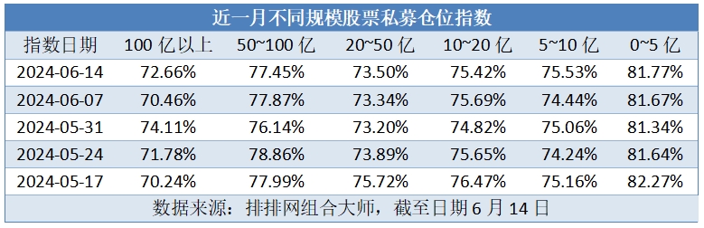 百亿私募加仓最积极。私募排排网数据显示,截至6月14日,100亿以上、50亿~100亿、20亿~50亿、10亿~20亿、5亿~10亿和0~5亿规模私募仓位指数依次为72.66%,77.45%、73.50%、75.42%、75.53%、81.77%,其中0~5亿规模私募仓位最高,20~50亿规模私募仓位最低。较上周相比,100亿以上私募加仓力度最大,其仓位指数较上周上升2.20%。