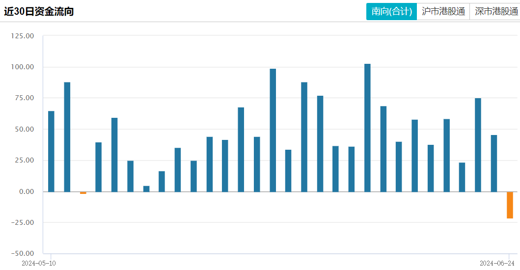 Wind数据显示,虽然周一(6月24日)南向资金出现净流出,但从5月14日至6月21日,南向资金已连续26个交易日出现净流入。近3个月合计净流入了2353.90亿元。