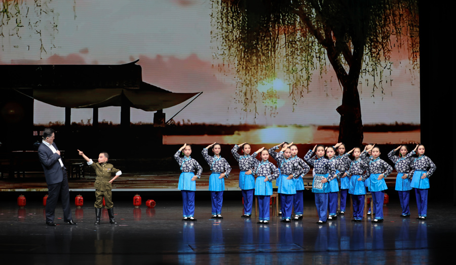 朱行小学学生与国家一级演员李建华一起表演沪剧《芦荡火种·智斗》选段。