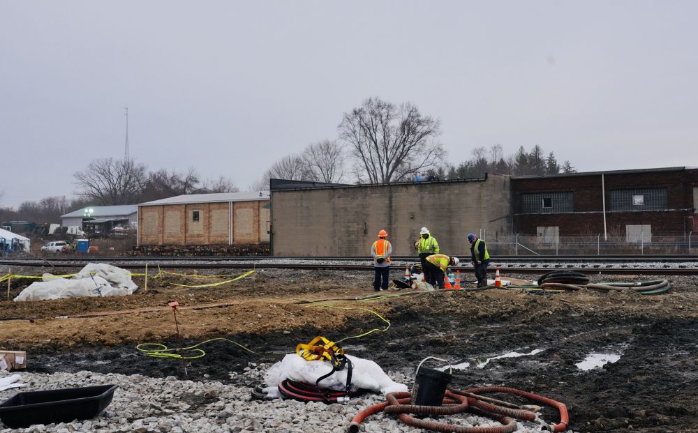 2023年2月14日,在美国俄亥俄州东巴勒斯坦镇,工作人员在事故现场附近处理污水。新华社发(章焱飞摄)