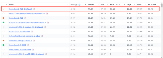 6月27日凌晨,AI模型领先平台“抱抱脸”(HuggingFace)公布全球开源模型排行榜,多款中国造开源模型上榜。其中,阿里的Qwen2-72B超越社交巨头Meta的Llama-3、法国大模型平台Mistralai的Mixtral等产品,成为开源模型排行榜第一名。李开复AI大模型公司零一万物的Yi-1.5也榜上有名。
