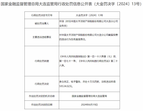 因对上述事项负有直接责任,对时任大连分公司业务员宗泽进行责令整改,给予警告并处罚10万元处罚,没收违法所得59534.02元。