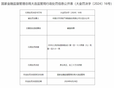 因截留保费,太平洋产险大连分公司被罚30万元
