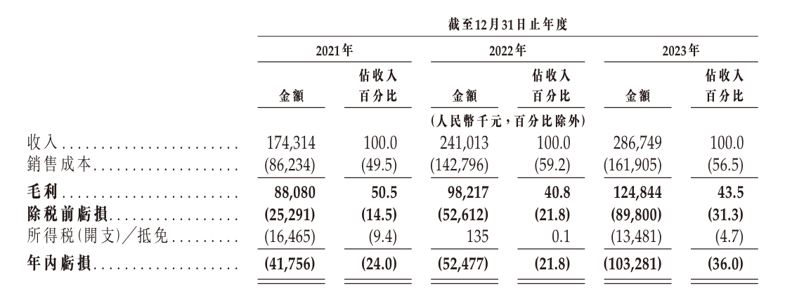 从财务数据来看,2021年、2022年、2023年越疆科技营收分别为1.74亿元、2.41亿元和2.86亿元,毛利率分别为50.5%、40.8%和43.5%,年内亏损分别为4175.6万元、5247.7万元、1.03亿元。
