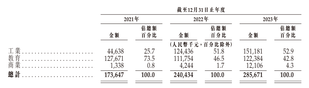 按应用场景来分,从2021年到2023年,工业场景收入占比逐渐上升并排在第一,2023年收入1.51亿元,占52.9%;教育场景收入占比逐渐下降并排在第二,2023年收入1.22亿元,占42.8%;商业场景收入占比较低,2023年收入1210.6万元,占4.3%。