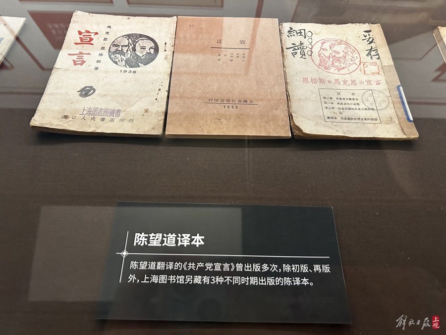 记者在现场看到,展柜中,仅《共产党宣言》不同译本就有15册。1920年初,陈望道在浙江义乌家中据日文版翻译完成《共产党宣言》首个中文全译本,8月由社会主义研究社印刷发行,书名初误印为“共党产宣言”。出版后很快赠售一空,次月即再版,同时纠正了书名的印刷错误。陈望道翻译的《共产党宣言》曾出版多次,除初版、再版外,上海图书馆还藏有另3种不同时期的陈译本,此次均为首度公开展出。