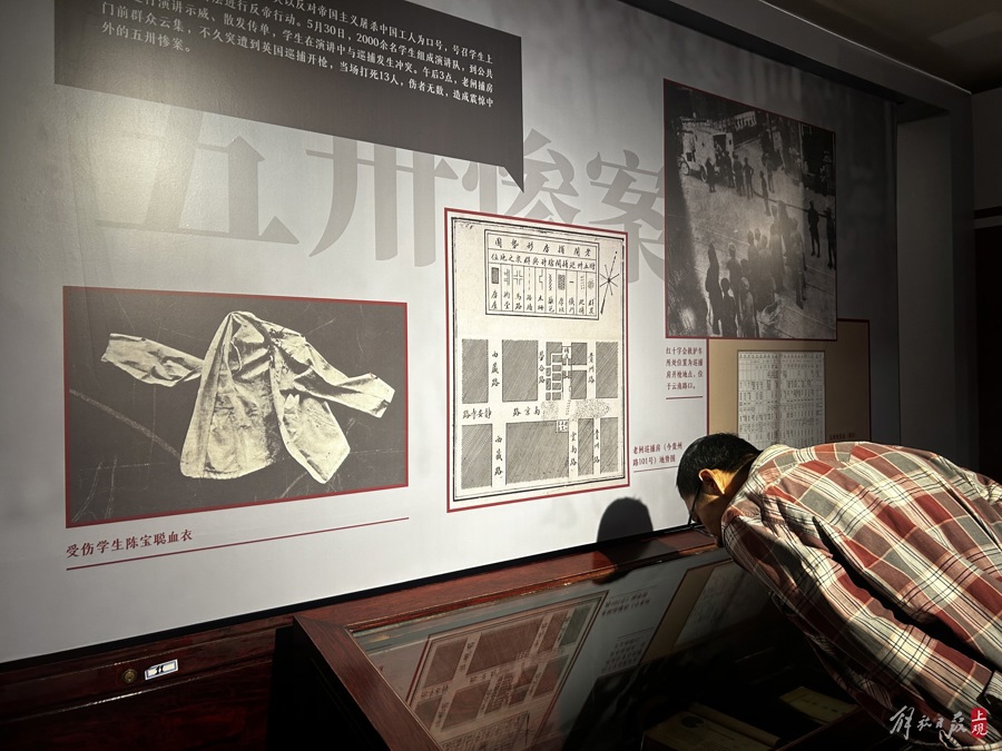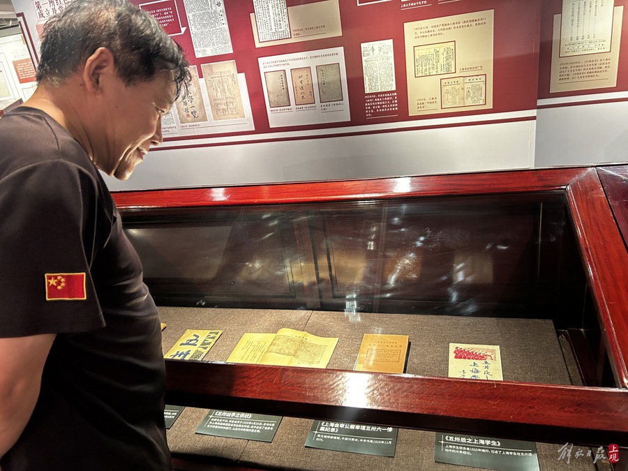 冯建忠俯身在展柜前仔细端详商务印书馆《东方杂志》“五卅事件临时增刊”。这是五卅运动中上海出版的唯一一份特刊,印刷过程中遇到电气骤停、栈房纸张因罢工无法提用等情况,东方杂志社克服困难,在1925年7月底出版了这期增刊。