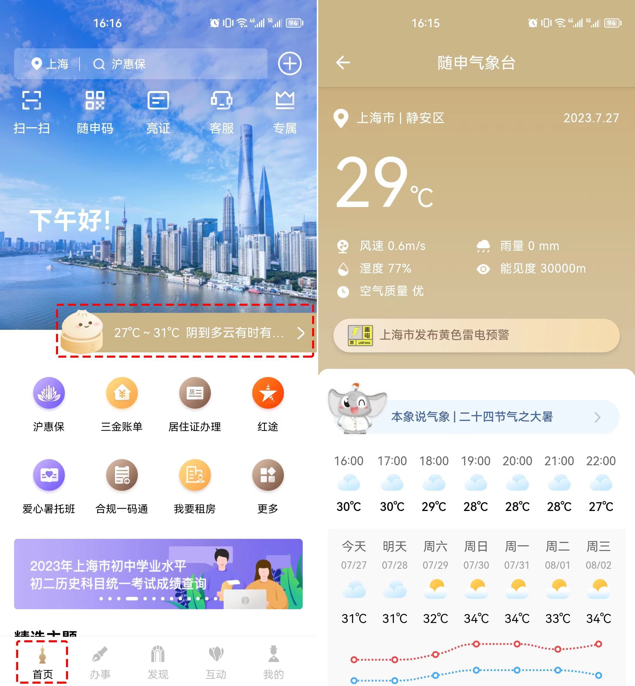 实时掌握天气情况,让出行更便利!登录“随申办市民云”APP→点击首页上方的“小笼包”图标旁的文字显示条→进入“随申气象台”服务后,支持实时查询未来天气情况,掌握更多天气资讯!