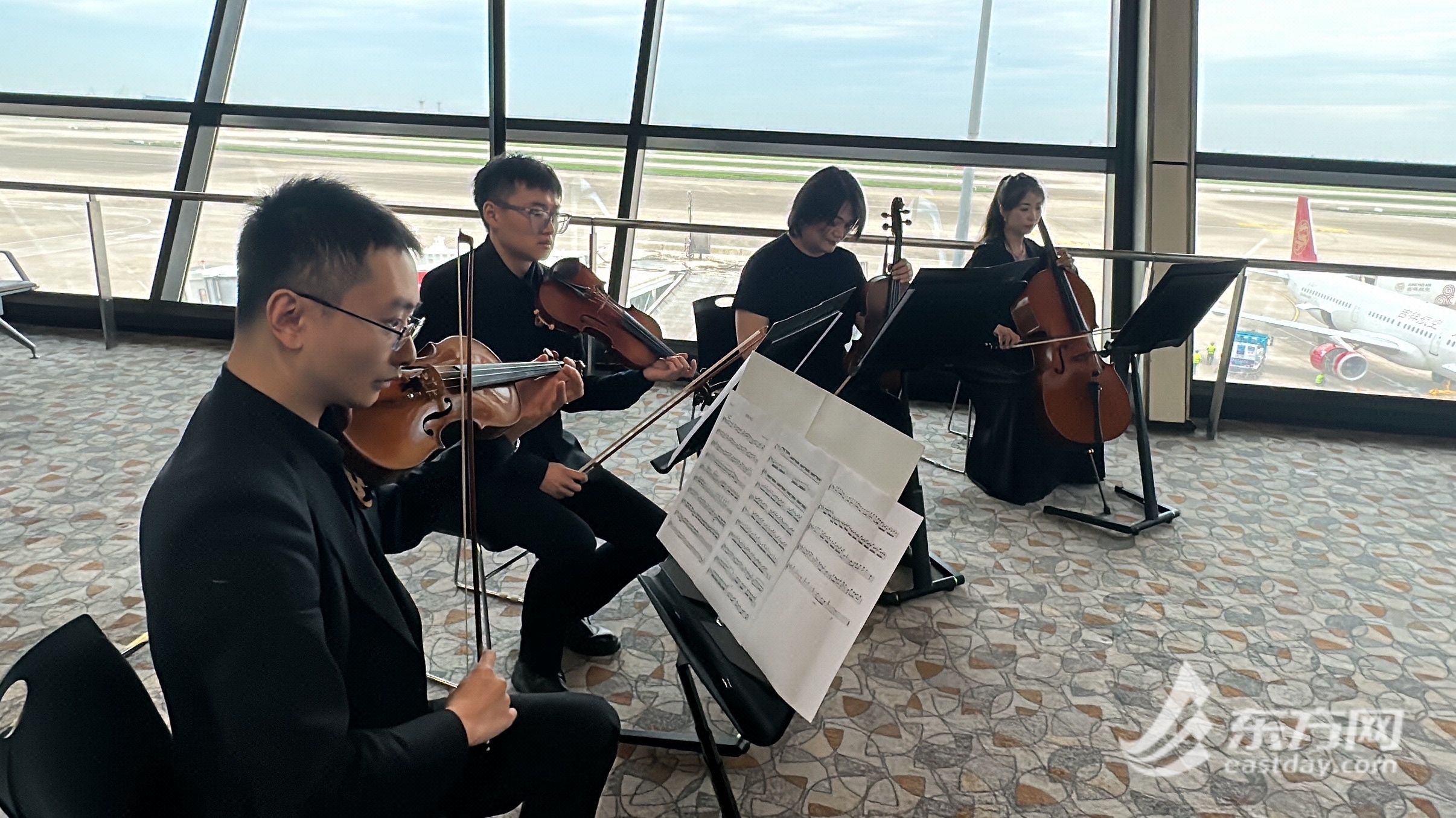 伴随着上海机场首个品牌日的推出,上海在两场航站楼还举行了精彩纷呈的文艺演出。东方网记者在浦东机场2号航站楼内看到,来自上海戏剧学院、上海音乐学院、上海轻音乐团等专业院校和机构为旅客奉上了一场“音乐大餐”。表演者用古筝、琵琶、二胡、笛子、小提琴、中提琴、手风琴等乐器演奏中外名曲,让旅客在上海机场感受到浓厚的艺术氛围。